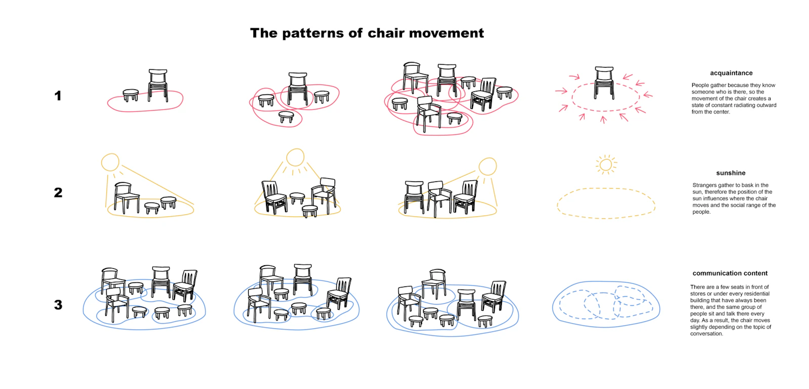 The patterns of chairs' movement in Xinyu xiaoqu, drawn by Boya Li, 2023