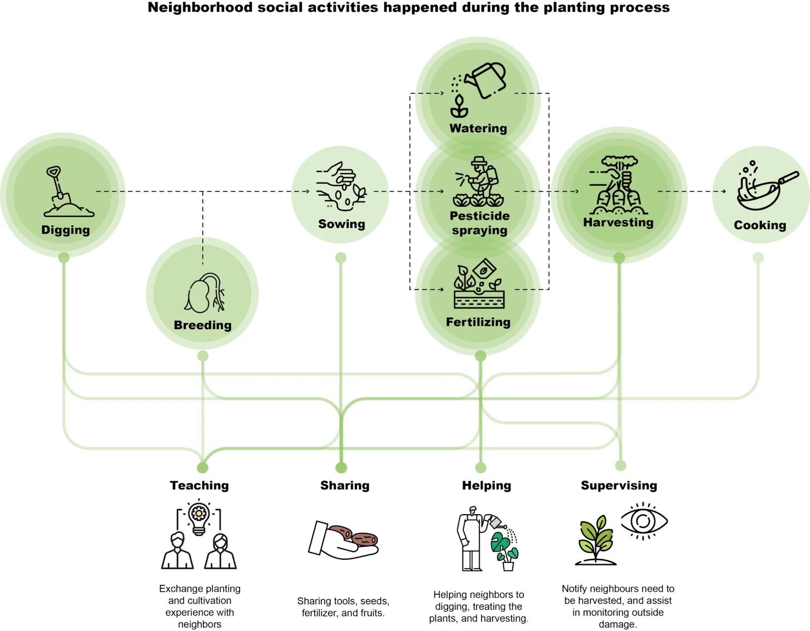 Neighborhood social activities happened during the planting process in Xinyu xiaoqu, drawn by Boya Li, 2023