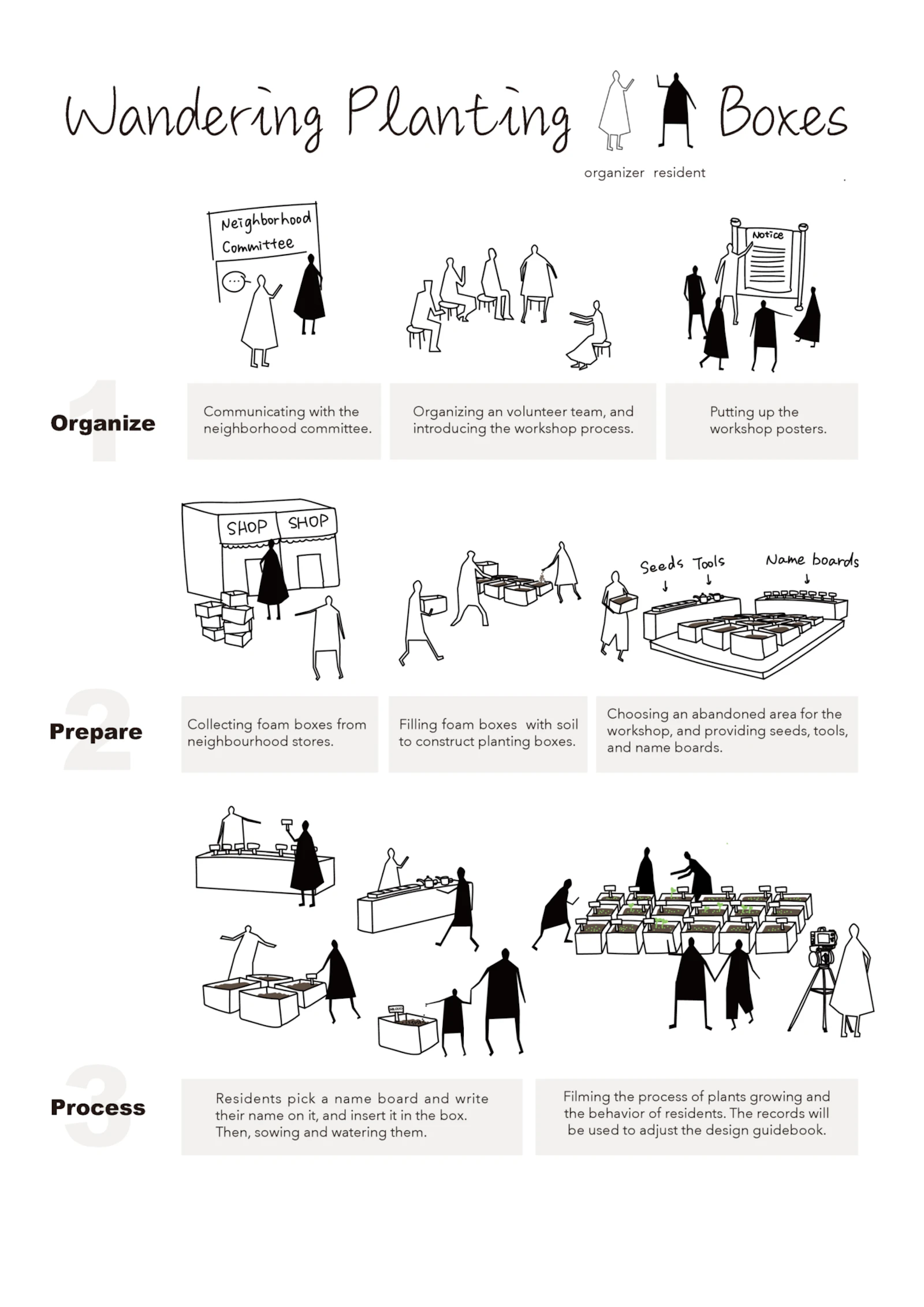Wandering Planting Boxes - A public engagement workshop plan, drawn by Boya Li, 2023
