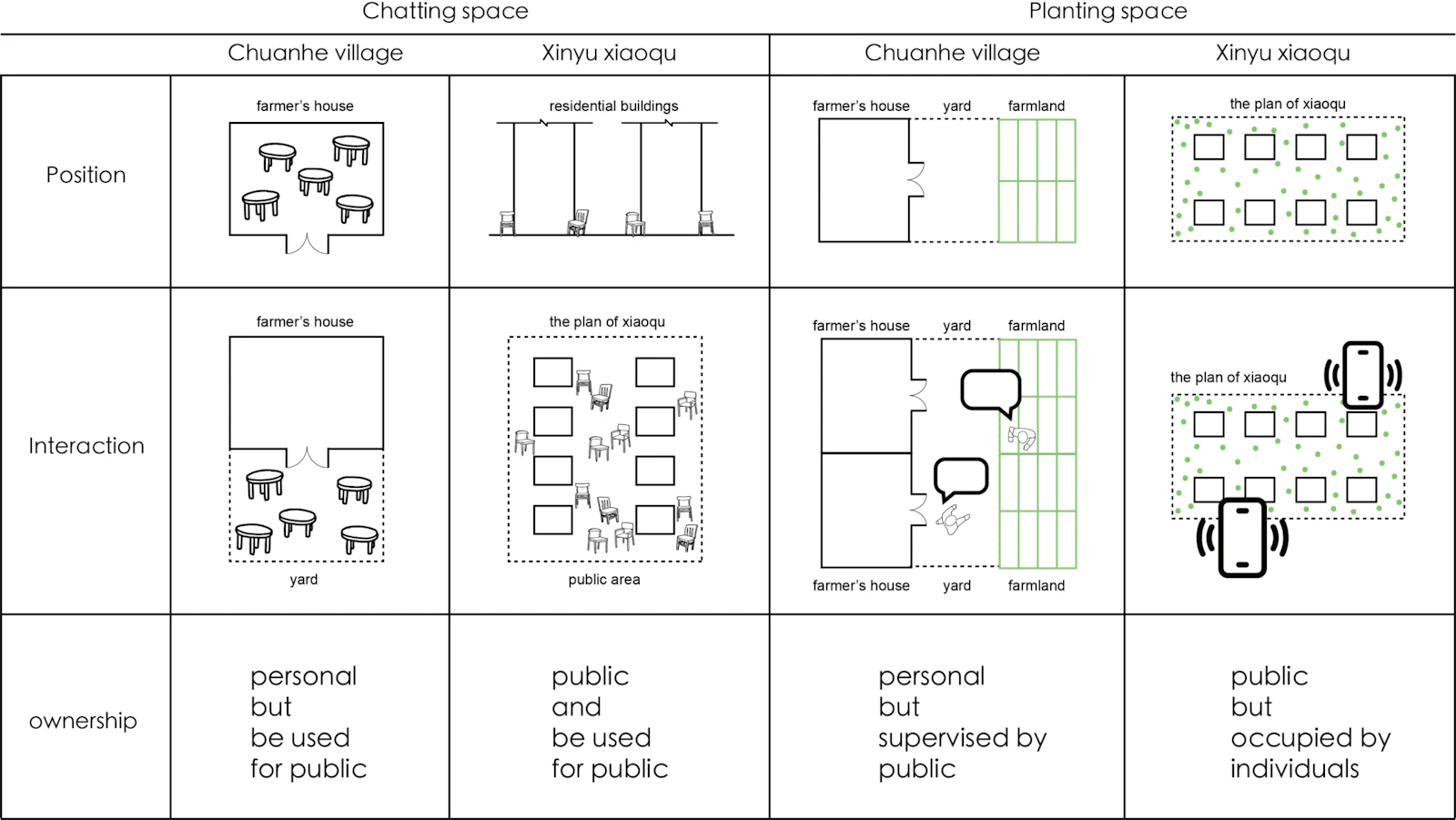 The comparison of two spontaneous spaces in Chuanhe village and Xinyu xiaoqu, drawn by Boya Li, 2023