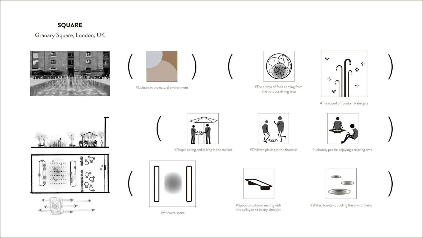 After analyzing and comparing the six spaces mentioned above, I found that they have similar spatial language. They all have a center space, poignant cinematic work, evocative sculpture, spontaneous street music performance, children skipping and playing in the fountain, calm spring lake, and ebbing and flowing sea, all of which are poetic and resonate most directly with people. The emotion they convey to people is beauty beyond language and words. Through behavior observation, there are always a lot of people who come alone. They are not lonely but revel in the spiritual world of their construction. With the same emotion in mind, I can feel the clouds above my head and theirs slowly gathering together. An organ is triggered by the object we are gazing at together, then little raindrops fall one by one, and a drizzle of steam envelops us. I know, my true self is returning.